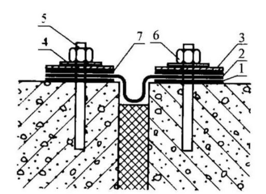 1—下基橡膠防水密封膠粘帶;2一內(nèi)置式密封止水帶;3一金屬壓板;4一墊片;5一預(yù)理螺栓;6—螺母:7—丁基橡膠防水密封膠粘帶