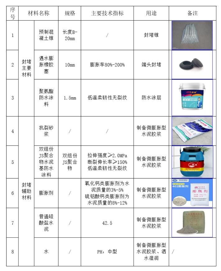 1、微膨脹型水泥膠漿、雙組份JS聚合物水泥基防水涂料、遇水膨脹橡膠塞、材料進場后檢驗材料防偽標識及規格,備齊合格證、