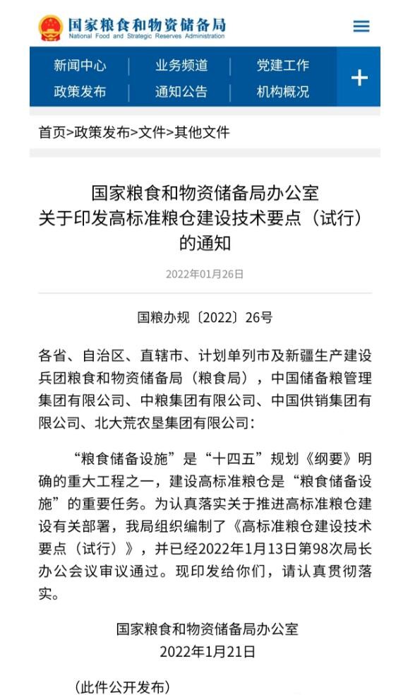2022年1月21日,國家糧食和物資儲備局發布《高標準糧倉建設技術要點(試行)》的通知。該要點明確了高標準糧倉建設的